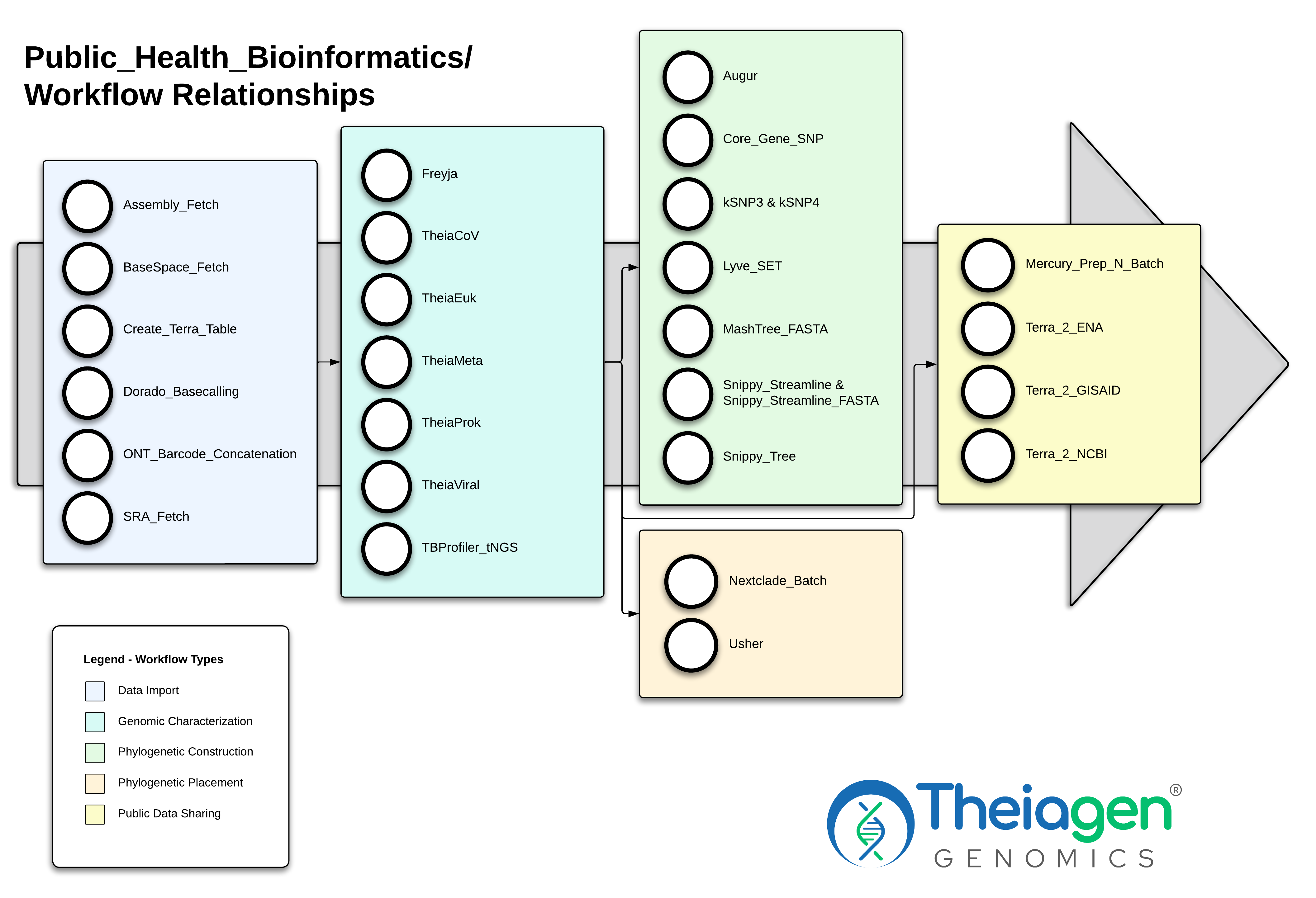 When undertaking genomic analysis using the command-line, via Terra, or other data visualization platforms, it is essential to consider the necessary and appropriate workflows and resources for your analysis. To help you make these choices, take a look at the relationship between the most commonly used Theiagen workflows.