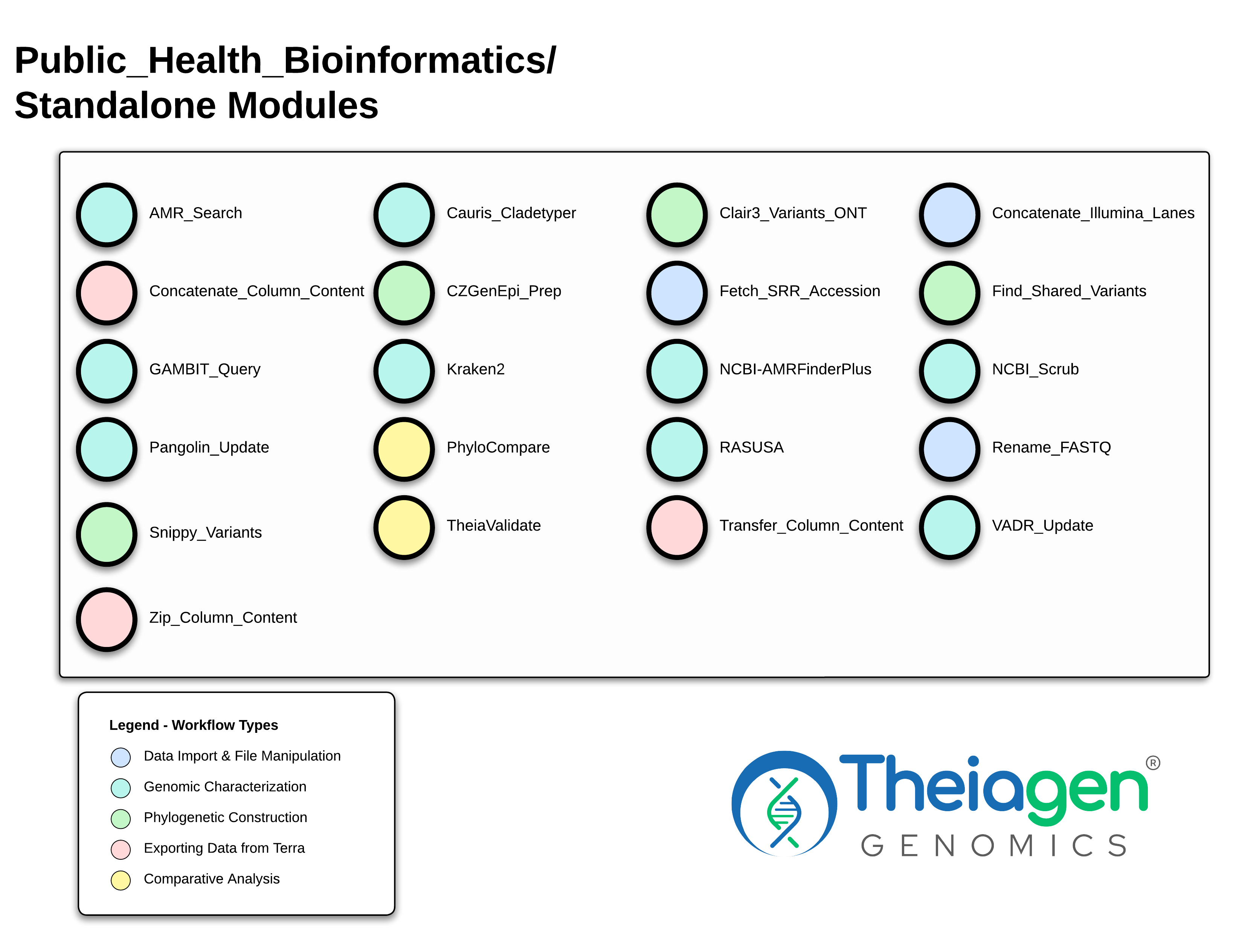 This diagram shows the available standalone workflows in the PHB repository, represented by circles, that are available for analysis of genomic data. Workflows are grouped by colors that represent the major types of analysis that they perform. These workflows can be used independently of the major workflow groupings as either supplements or alternatives.