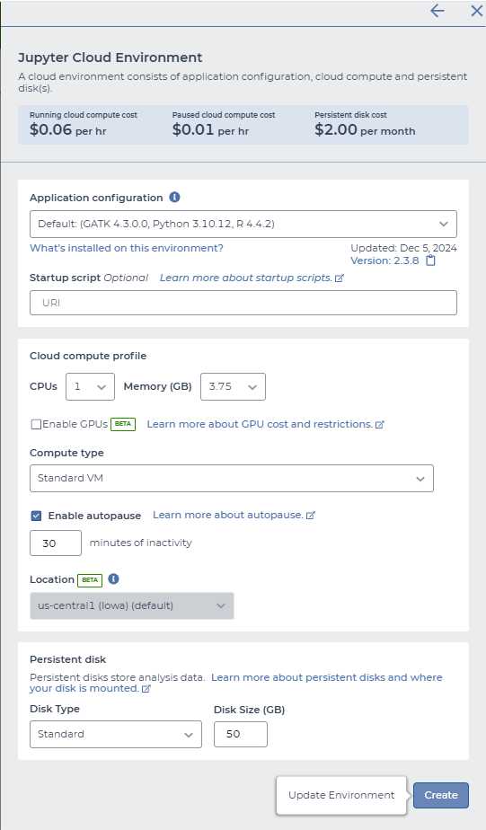 Click "CREATE" at the bottom of the "Jupyter Cloud Environment" page. There is no need to alter the default environment configuration.