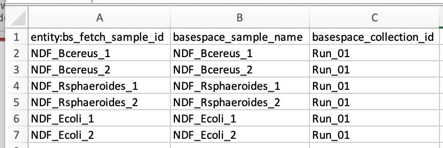 In Excel or an alternative spreadsheet software, set up a metadata sheet for Terra, with a row for each sample. Please feel free to use our BaseSpace_Fetch Template to help ensure the file is formatted correctly.