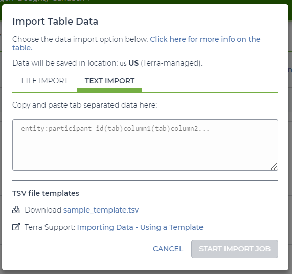 In Terra, navigate to the "DATA" tab, click "IMPORT DATA" then "Upload TSV"