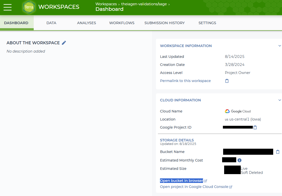 1. Navigate to your Terra workspace's Dashboard page and click on "Open bucket in browser" under the "Cloud Information" toggle on the right hand side.