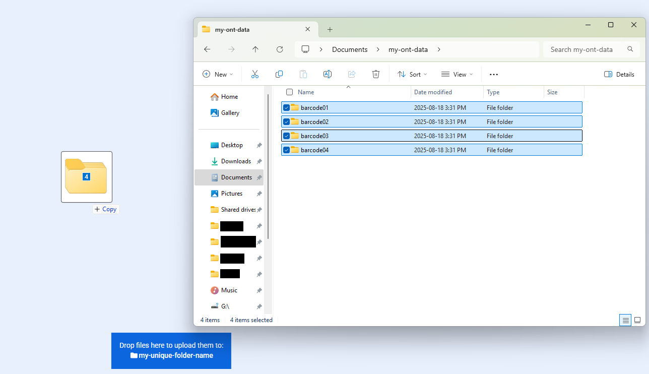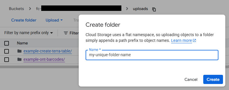 The input_bucket_path in would point to gs://input_bucket_path/, and the workflow would automatically find and concatenate all reads within each subdirectory (both barcode*/ and random_name/). Learn how to upload your files in this structure below. Please note: If there are reads located in the parent directory (e.g., ABC123_these_files_will_be_ignored_0.fastq.gz and ABC123_these_files_will_be_ignored_1.fastq.gz), they will be ignored.