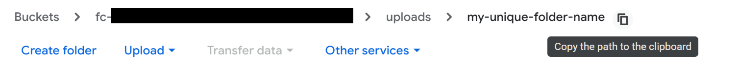 5. Once your files are uploaded, you can identify the input_bucket_path by clicking on the two squares next to the file path at the top of the screen, shown below. When pasting this into the workflow inputs, you will need to add the gs:// prefix.